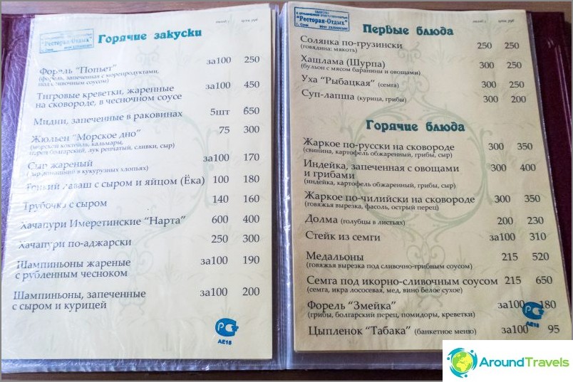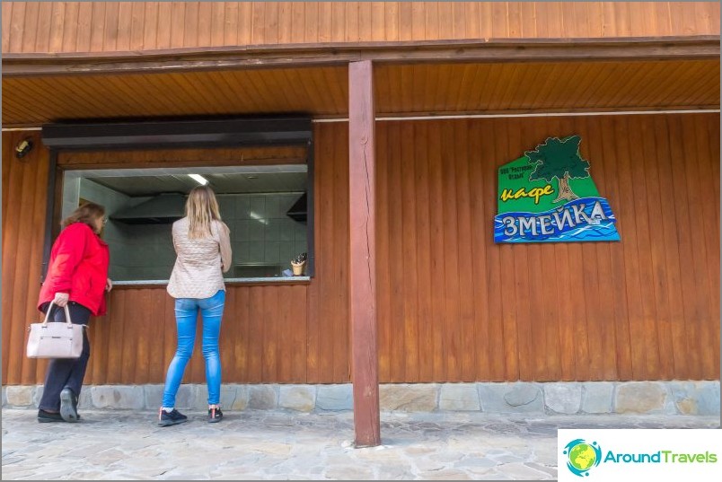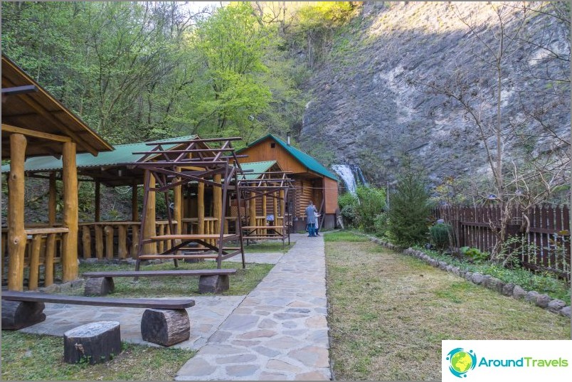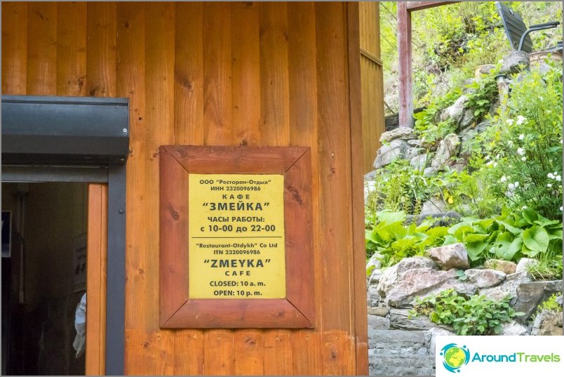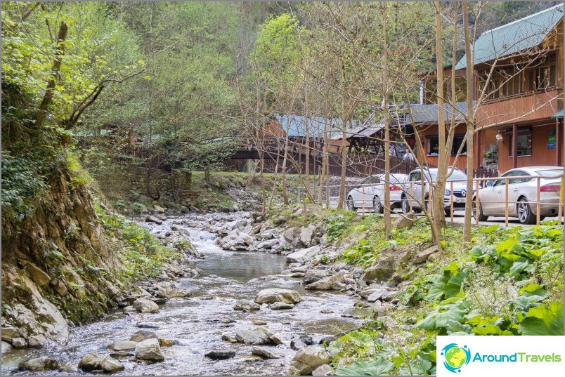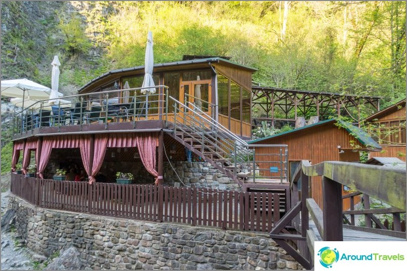 Cafe «Snake» near the Zmeikovsky waterfalls in Sochi - this is a restaurant-monopoly of the entire attraction. The institution was built right on the river bed, and its two halves are connected by a small footbridge - an excellent viewpoint, by the way, for shooting the first Zmeikovsky waterfall. If you look at the waterfall, then on the right will be the main building with two floors, with a kitchen and a ticket office for the entrance to the trekking. And on the left - covered wooden gazebos with a gravel yard, apparently it is needed during the high season, when the flow of tourists is off the charts. In April 2018, I walked here almost in splendid isolation..