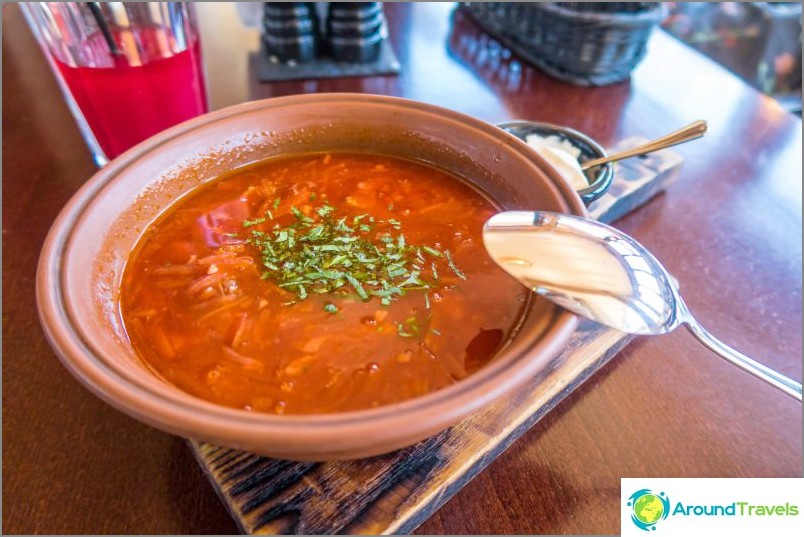 I chose a place on the veranda, where the waiter immediately opened several windows to let in fresh air. By the middle of the day, the veranda had time to warm up. Ten minutes later, the windows were closed, the air conditioners were turned on - it became cool. Outside the veranda window, I saw the courtyard of the inn, where a children's swing and something like a playground were installed in the shade of the building. Then they brought me fruit drink and borscht, so I switched to food and for the next half hour I enjoyed a well-prepared dish..